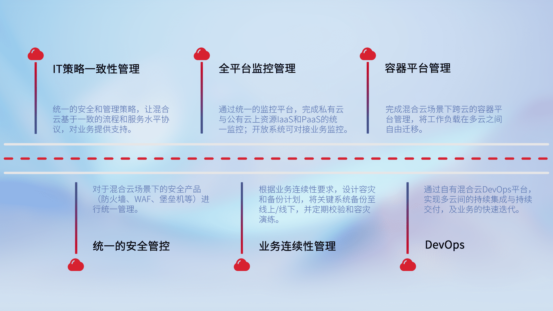 通过多云纳管,,,以统一的资源数据模型把客户的云资源进行抽象和封装,,,进而实现对多云资源的统一操作,,保障云资源管理的可靠性、、、、稳定性与可用性。。。。量身定制化运维内容,,,配置、、开发运维、、、补丁管理、、备份、、、、监控、、认证和访问管理、、、审计和日常巡检等,,,,保障在用云过程中的可靠度,,稳定度以及高可用率。。。。